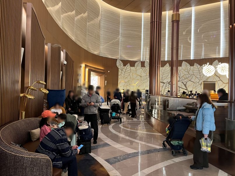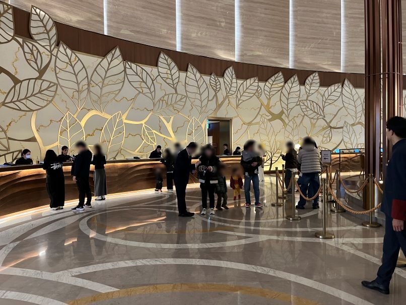 スタッフにチェックインの旨を伝えるとタブレットにメールアドレスを入力し連絡が来るシステムです。それまでスーツケースを預け、ホテル内を探索することにしました。40分ほど待ってようやく順番が来て、そこからさらに5分ほど並んでチェックインが完了しました。