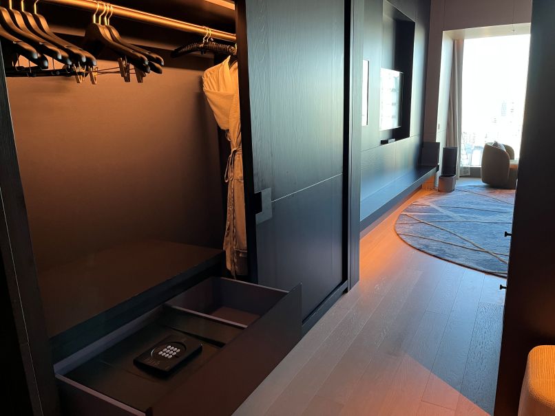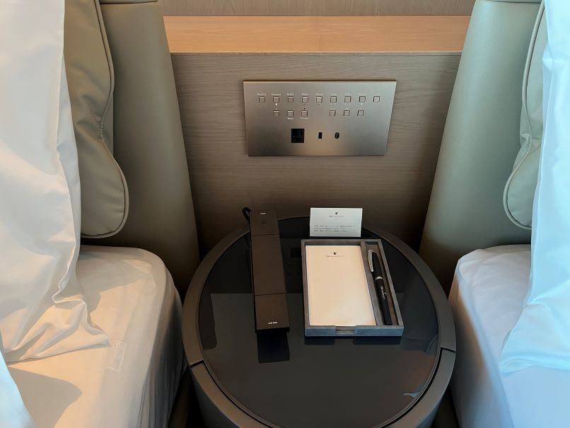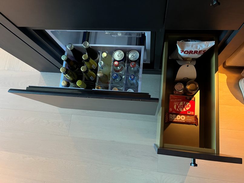 案内された客室の2614号室へ。ドアを開けるとカーテンと照明が自動で連動してスイッチが入る仕組みになっており、入室した瞬間に特別感があります。室内は黒と木を基調としたシックで落ち着いた雰囲気。写真を撮りながら、17時から始まるオードブルの時間を待ちました。