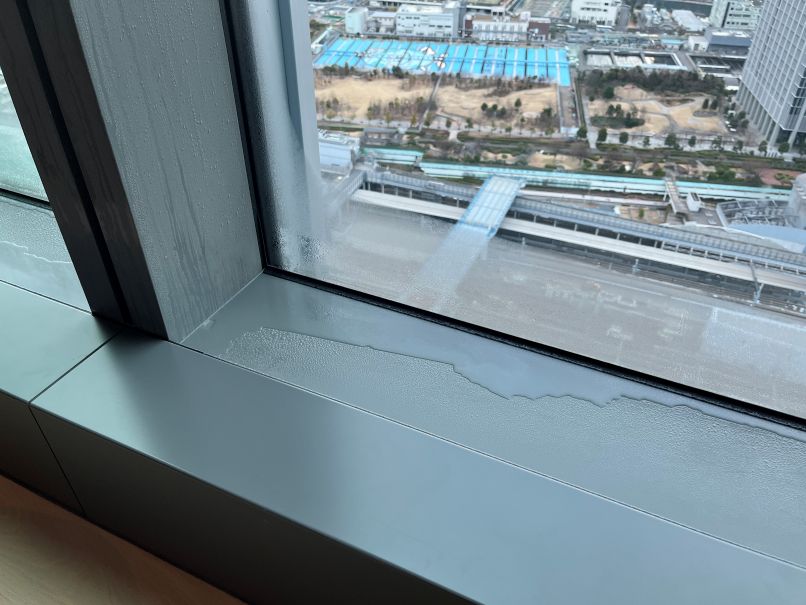 曇っていて部屋から日の出は見られませんでしたが、眺めは良く気持ちのいい朝です。ただ、外気温との差が大きく(2月下旬)、窓の結露はかなりありました。