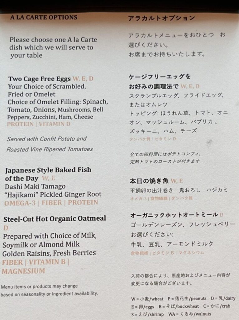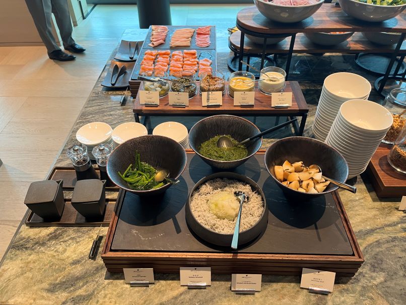ラウンジのビュッフェは品数は少なめですが、見た目がとても綺麗です。3品から選べるメニューがあり、焼き魚(本日は鯛)とオムレツを選びました。