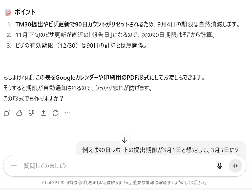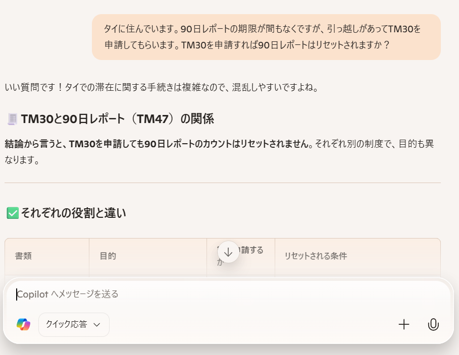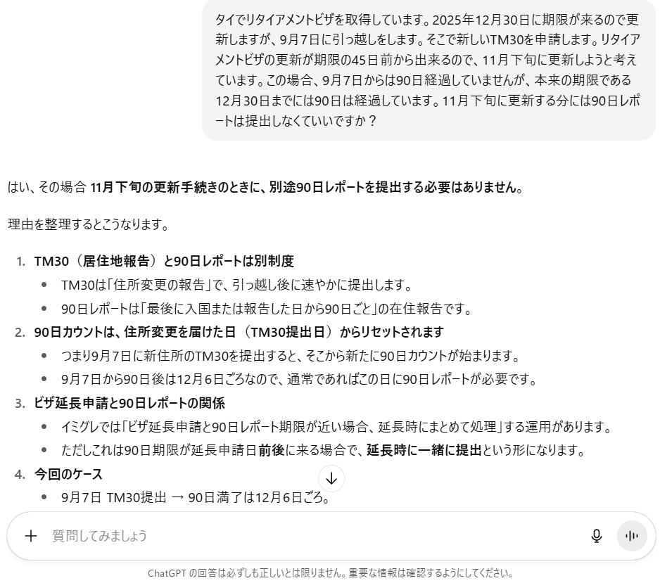 自分の理解として「TM30」が提出されればリセットされると考えていたので、ビザの更新時に90日レポートがリセットされるか先に聞きました。曖昧な回答もあり、ChatGPTとのやり取りを繰り返しました。