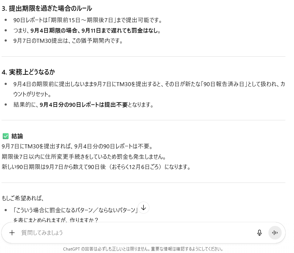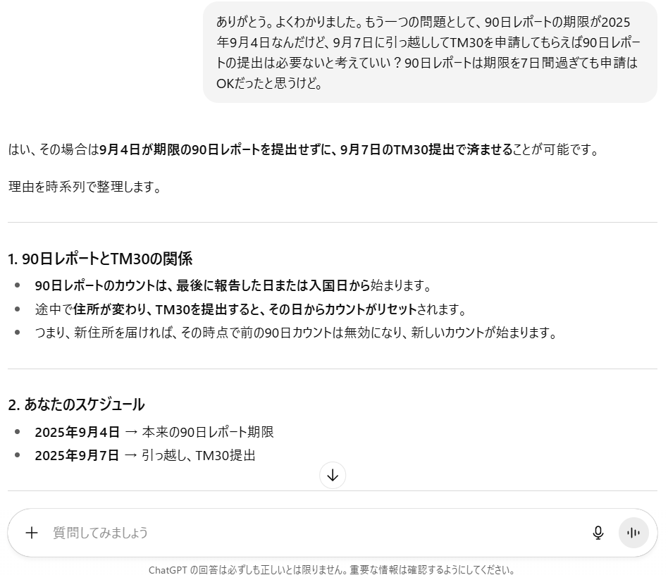 過去や一部の地方では、入管職員の運用に差があり「TM30を出したらその場で対応してくれた」「結果的に90日の管理が変わった」ような実務上の事例が存在します。そうした断片的な実例を私が一般ルールと取り違え、確証なく一般化してしまいました。