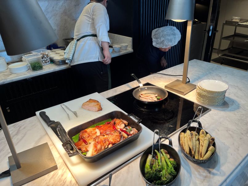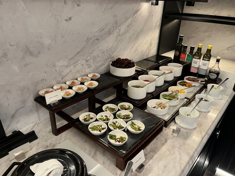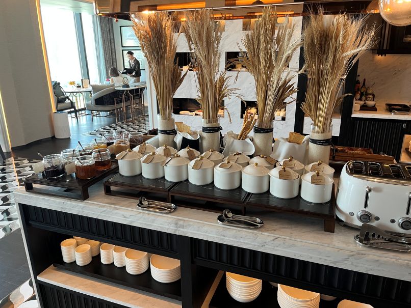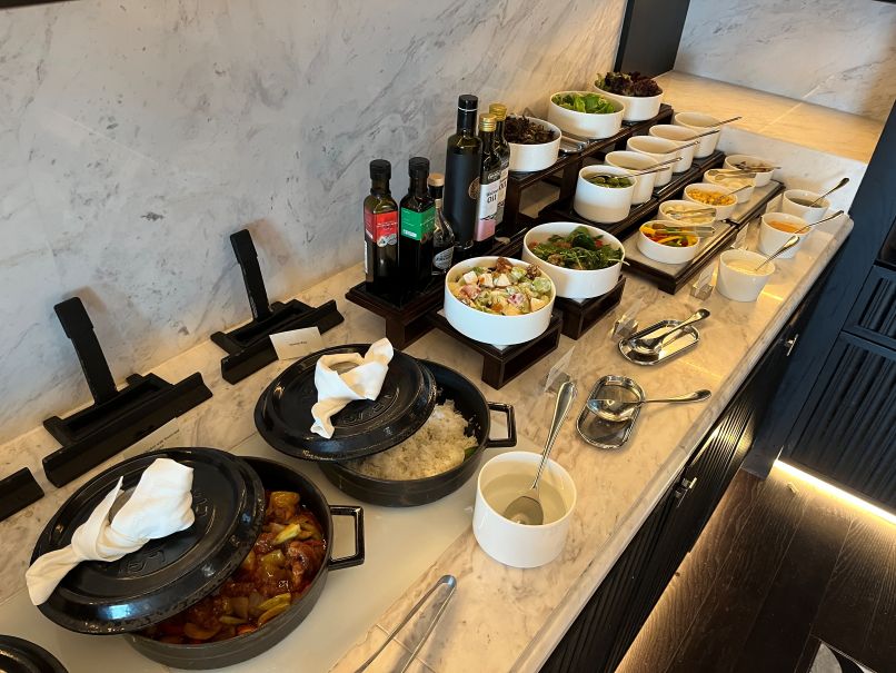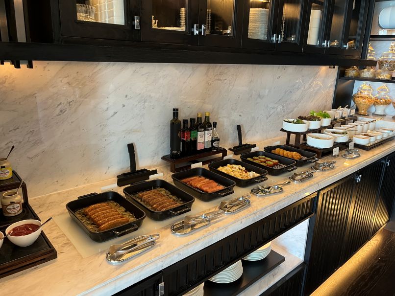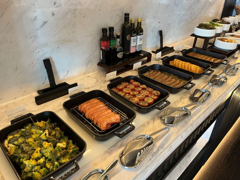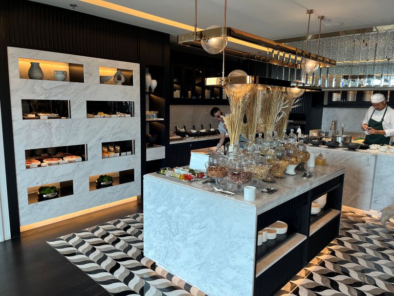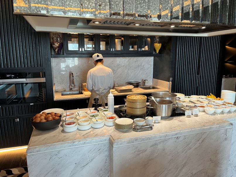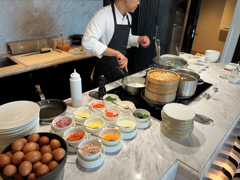 ラウンジは落ち着いた雰囲気で、広い窓からは街並みが一望できます。チェックインが終了するとスタッフから「朝食が10時半までですので、よろしければどうぞ」と案内を受け、そのまま朝食へ。卵料理やお粥、麺類はオーダー制、点心も充実。平日ということもあり人が少なく、静かな空間で食事を楽しめました。