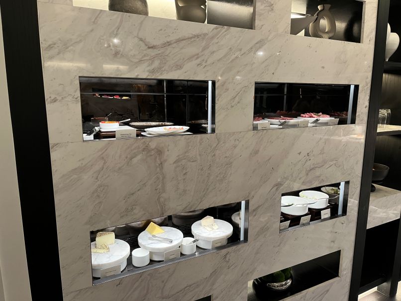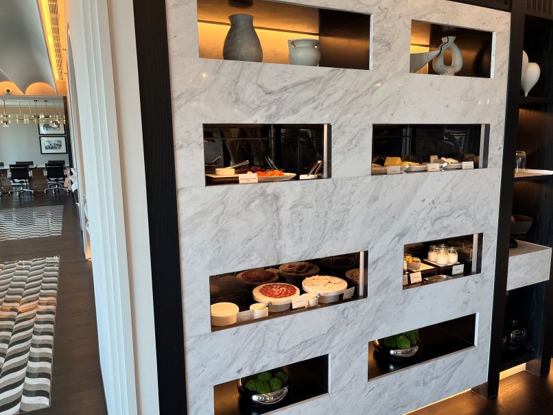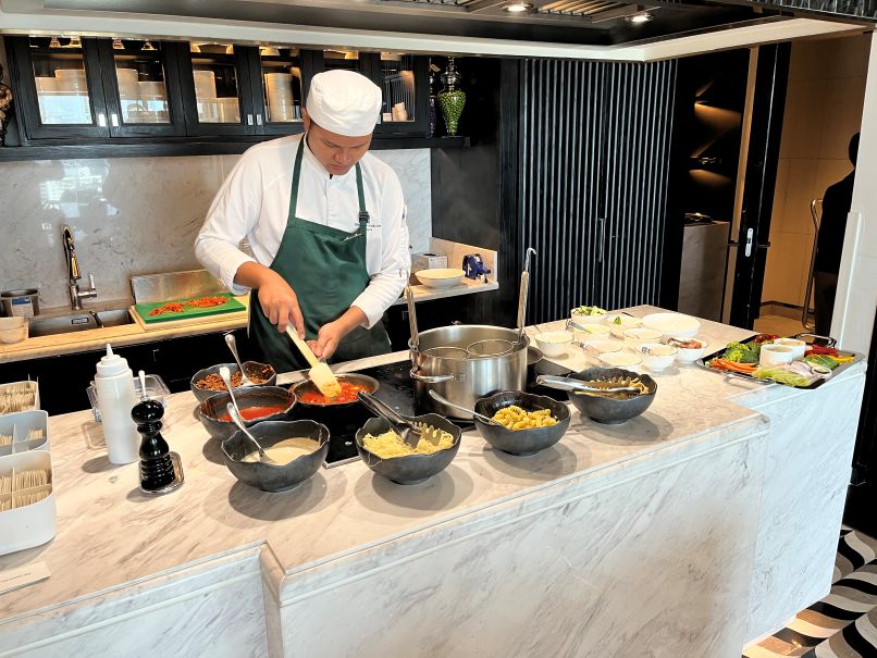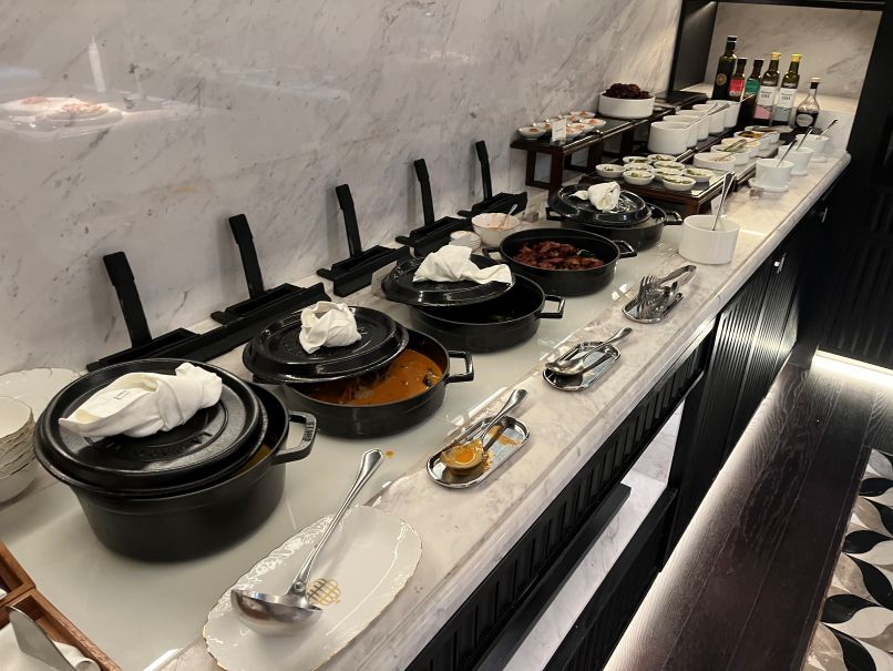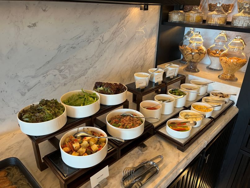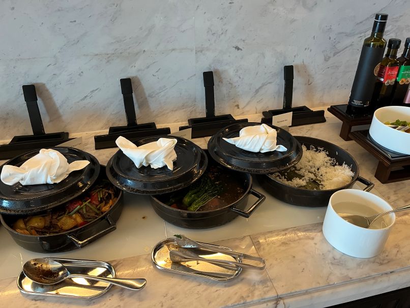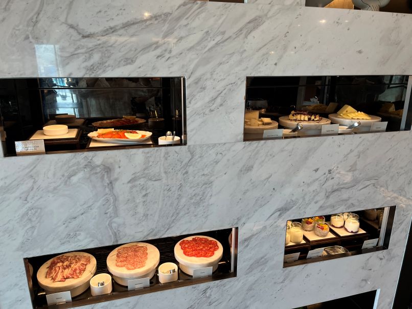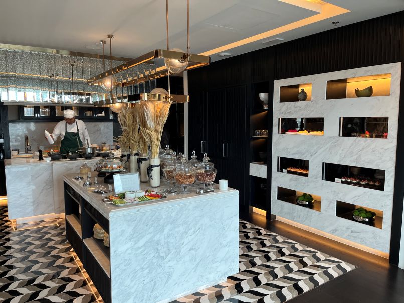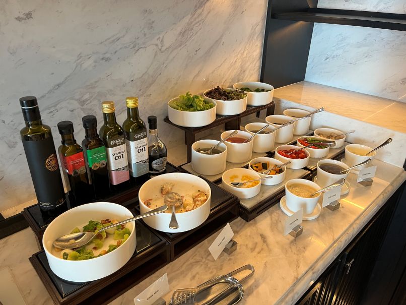 ラウンジは落ち着いた雰囲気で、広い窓からは街並みが一望できます。チェックインが終了するとスタッフから「朝食が10時半までですので、よろしければどうぞ」と案内を受け、そのまま朝食へ。卵料理やお粥、麺類はオーダー制、点心も充実。平日ということもあり人が少なく、静かな空間で食事を楽しめました。
